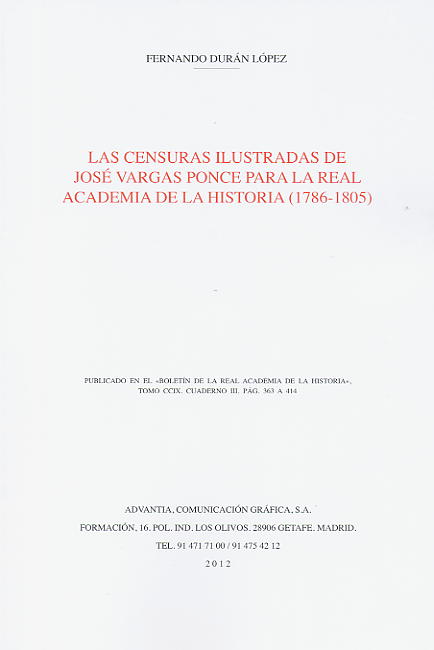 71.- «Las censuras ilustradas de José Vargas Ponce para la Real Academia de la Historia (1786-1805)», Boletín de la Real Academia de la Historia, t. CCIX, cuaderno III (septiembre-diciembre 2012), pp. 363-414. ISSN: 0034-0626. [PDF]