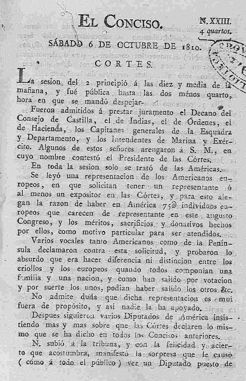 Este estudio analiza la reacción de la prensa liberal gaditana a la inesperada aparición de la «cuestión de América» justo al comienzo de las sesiones de las Cortes en octubre de 1810, lo que es tanto como decir la reacción del grupo liberal de los diputados, pues en este punto el frente parlamentario y el frente periodístico de los reformistas parece estar alineado. La cobertura de la prensa a ese asunto da una idea ilustrativa del modo en que política, ideológica y aun psicológicamente fueron abordadas las reivindicaciones americanas en el liberalismo doceañista y del proceso que este tuvo que experimentar para afrontarlas: el intento de ignorarlas primero, una crítica frontal después y finalmente un compromiso insatisfactorio entre la aceptación conceptual del principio de igualdad de representación y la necesidad puramente política de no aceptarla de inmediato. Se analizan para ellos artículos de El Observador-Cortes, Semanario Patriótico, El Conciso y El Patriota en las Cortes.
