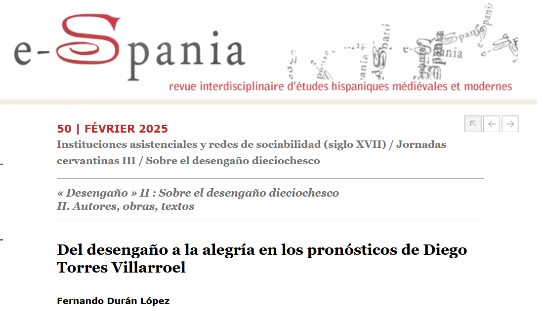 155.- «Del desengaño a la alegría en los pronósticos de Diego Torres Villarroel», e-Spania. Revue interdisciplinaire d’études hispaniques médiévales et modernes, nº 50 (febrero, 2025), en línea desde el 24-II-2025. ISSN-e 1951-6169. http://journals.openedition.org/e-spania/54264
