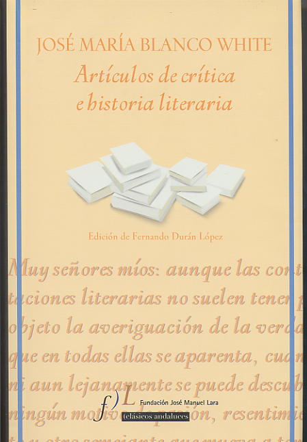 8.- José María Blanco White, Artículos de crítica e historia literaria. Edición, introducción y notas de Fernando Durán López, Fundación José Manuel Lara (Clásicos Andaluces), Sevilla 2010 (CXXXI + 346 pp.). ISBN: 978-84-96824-62-1.