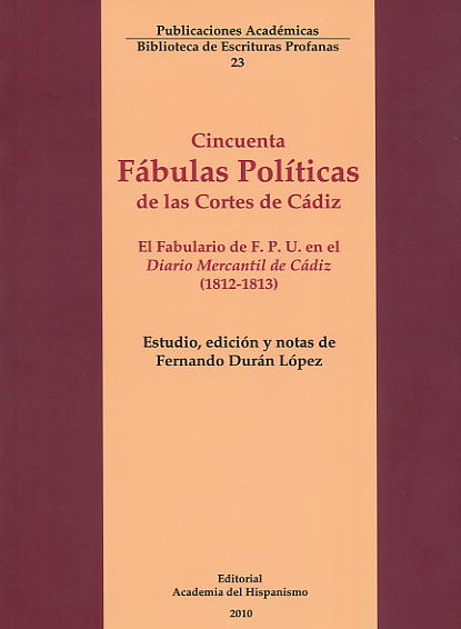 7.- Cincuenta fábulas políticas de las Cortes de Cádiz. El fabulario de F. P. U. en el Diario Mercantil de Cádiz (1812-1813), Editorial Academia del Hispanismo (Biblioteca de Escrituras Profanas, 23), Vigo 2010 (190 pp.). Estudio, edición y notas de Fernando Durán López. ISBN: 978-84-96915-78-7.